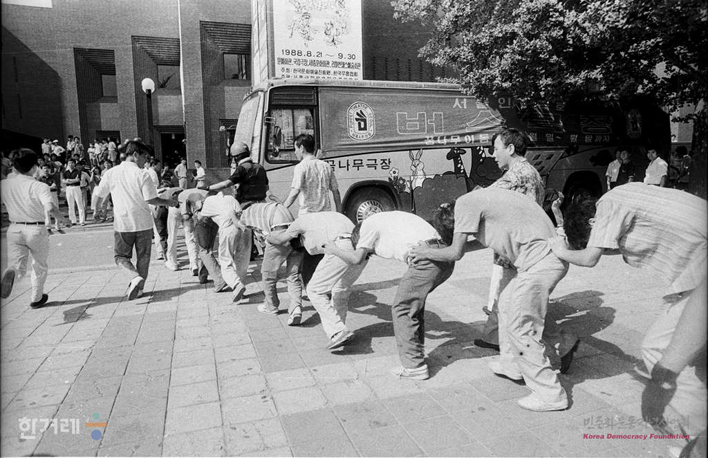 - 1988년 8월 14일 오후4시 전대협소속 대학생들과 재야단체 인사들과 시민들이 서울 대학로에서 평화통일염원대동제를 갖으려다 경찰의 봉쇄에 막혀 서울의대입구에서 항의집회를 갖다 경찰에 연행되고 있다.