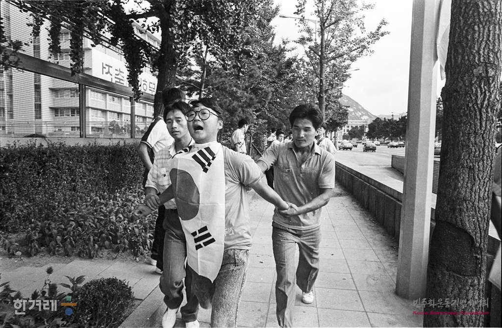 - 1988년 8월 15일. 전국 1백30여개 대학생과 재야인사, 시민참관인단 등 5천여명은 연세대 민주광장에서 ’8.15민족해방 43주년 기념식과 공동 올림픽 쟁취 및 평화협정 체결을 위한 8.15 남북청년학생회담 출정식을 마친 구국결사대 한 대원이 미국대사관 항의방문을 하다 경찰에 연행되고 있다.