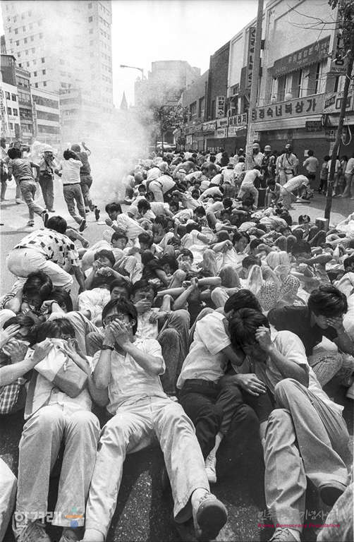 - 1988년 8월 15일 오후3시 20분 ’8.15민족해방 43주년 기념식과 공동 올림픽 쟁취 및 평화협정 체결을 위한 8.15 남북청년학생회담 출정식을 마친 학생들이 서울 중구 회현동 남대문시장 앞길에서 드러누워 농성을 벌이고 있다.