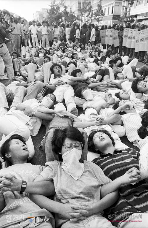 - 1988년 8월 15일 오후3시 20분 ’8.15민족해방 43주년 기념식과 공동 올림픽 쟁취 및 평화협정 체결을 위한 8.15 남북청년학생회담 출정식을 마친 학생들이 서울 중구 회현동 남대문시장 앞길에서 드러누워 농성을 벌이고 있다.