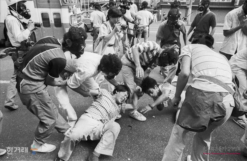 - 1988년 8월 15일 오후3시 20분 ’8.15민족해방 43주년 기념식과 공동 올림픽 쟁취 및 평화협정 체결을 위한 8.15 남북청년학생회담 출정식을 마친 학생들이 서울 중구 회현동 남대문시장 앞길에서 드러누워 농성을 벌이다 경찰에 연행되고 있다.