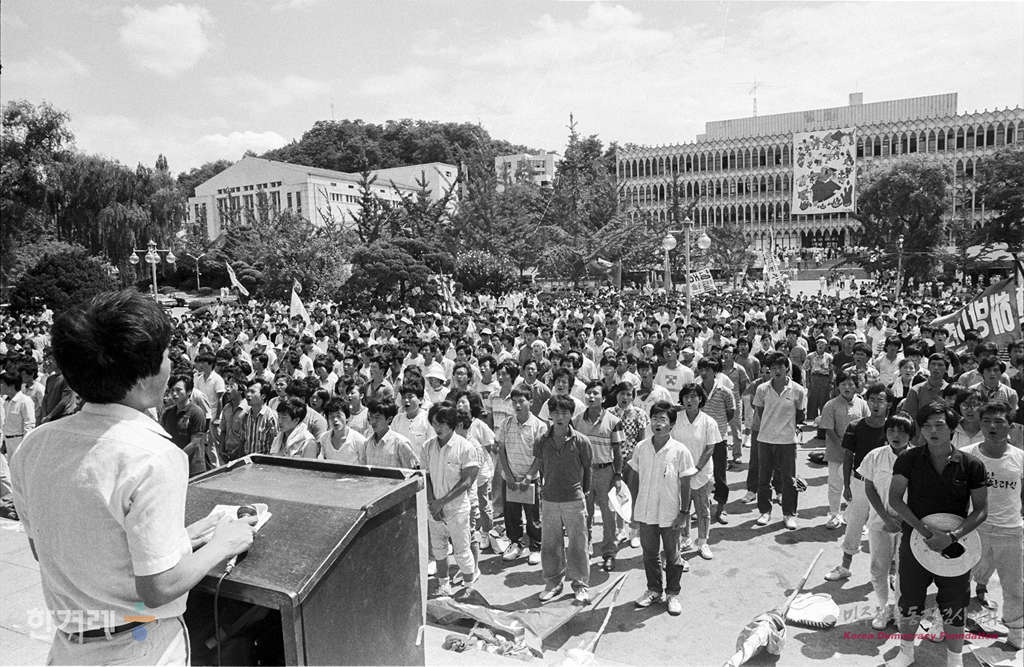 - 1988년 8월 16일 전대협 학생들이 연세대 민주광장에서 ‘8.15 남북학생회담 원천봉쇄 규탄대회’를 하고 있다.