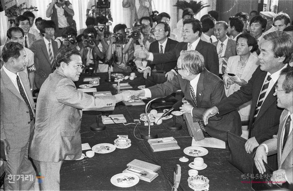 - 1988년 8월 19일. 판문점내 북한쪽 지역인 통일각에서 남북국회회담을 위한 예비접촉이 열려 박준교 한국쪽 단장(오른쪽)과 전금철 북한쪽 단장이 서류를 교환하고 있다. 이들은 회담 의재와 형식에 대한 이견차를 좁히지 못해 20일 우리쪽 지역인 평화의 집에서 다시 만나기로 했다.