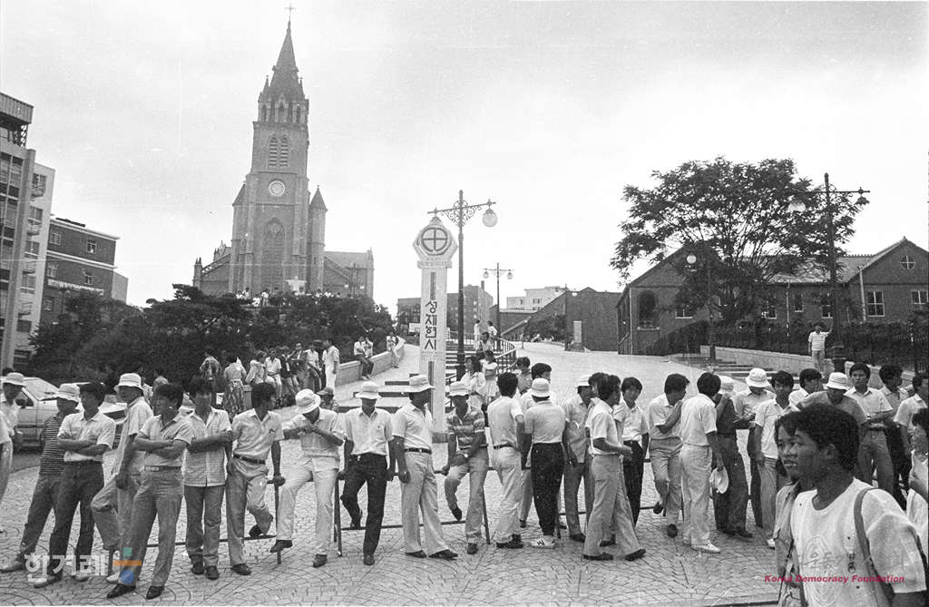 - 1988년 8월 22일. 한반도 평화와 통일을 위한 세계대회 직전 행사인 고 조성만씨 백일제가 명동성당쪽의 집회불허 방침에 따라 경찰이 봉쇄한 가운데 유가족과 계훈제씨 등 재야인사가 명동성당입구에서 항의를 하고 있다.