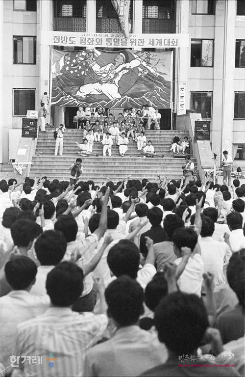 - 1988.08.23. 시민과 학생들이 한반도 평화와 통일을 위한 세계대회 개막식이 평화구역내의 불법집회로 간주 개막식 예정집회장소인 성균관대를 경찰이 봉쇄하자 고려대 민주광장으로 장소를 변경해 대회를 하고 있다.