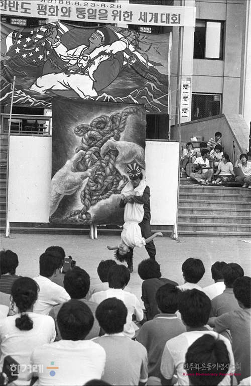 - 1988년 8월 24일 한반도 평화와 통일을 위한 세계대회가 2일째인 피폭자 대회와 반전반핵 결의대회가 고려대 민주광장에서 열려 국내외 반전반핵 대표와 피폭자 가족등이 참석한 가운데 공연을 지켜보고 있다.