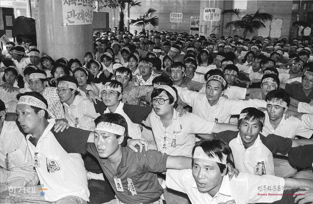 - 1988년 8월 25일 오후 6시 문화방송 노동조합 조합원들이 방송민주화를 요구하며 회사로비에서 파업농성을 하고 있다. 한국방송사상 노조원들이 파업에 들어간 것은 이번이 처음이다.