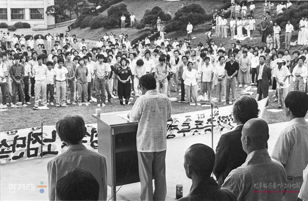 - 1988년 7월 28일 오후 5시 30분 한반도 평화와 통일을 위한 세계대회 및 범민족대회 추진본부에서 서울 종로구 성균관대 금잔디광장에서 재야인사, 국제반전박핵운동가, 시만 , 대학생 5벽 여명이 참석한가운데 폐막식을 하고 있다.