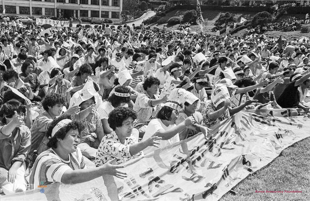 - 1988년 7월 28일 오후 5시 30분 한반도 평화와 통일을 위한 세계대회 및 범민족대회 추진본부에서 서울 종로구 성균관대 금잔디광장에서 재야인사, 국제반전박핵운동가, 시만 , 대학생 5벽 여명이 참석한가운데 폐막식을 하고 있다. 이날 행사이전 치러진 노점상 생존권대회에 참석했던 노점상도 함께했다.