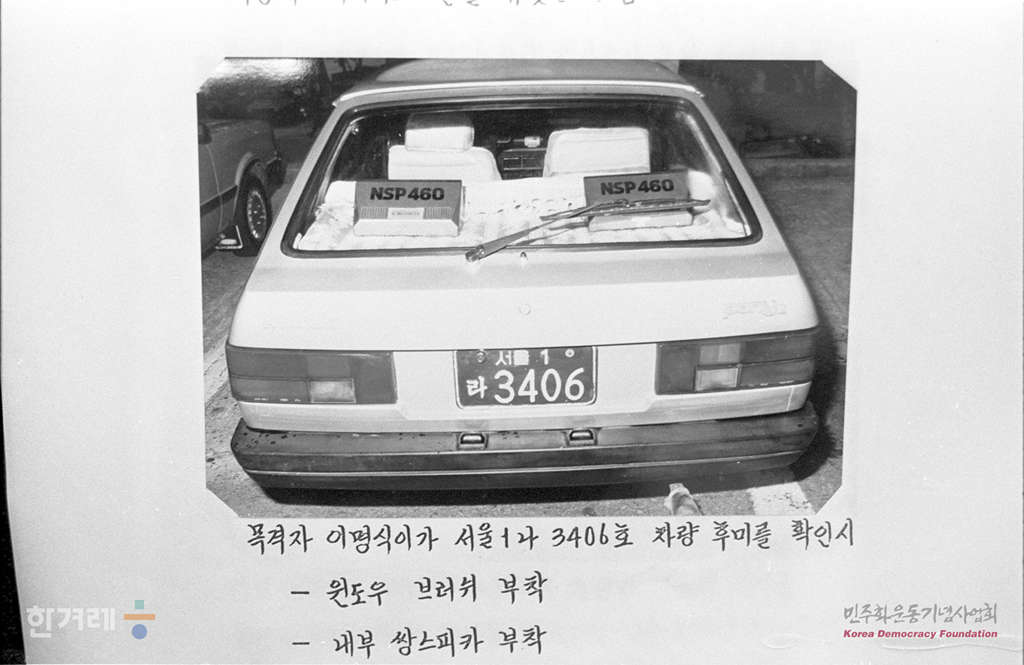 - 1988년 8월 31일 국회에서 열린 국방위원회에서 중앙경제신문 오홍근 사회부장 테러사건과 관련해서 공개된 자료. 사진은 목격자 이명식씨가 군 범죄수사기관이 실시한 차량 대질신문에서 서울1라 3406호 포니2를 보고 사건 당시에 본 차와 모습이 다르다고 손을 젖고 있는 모습이다.