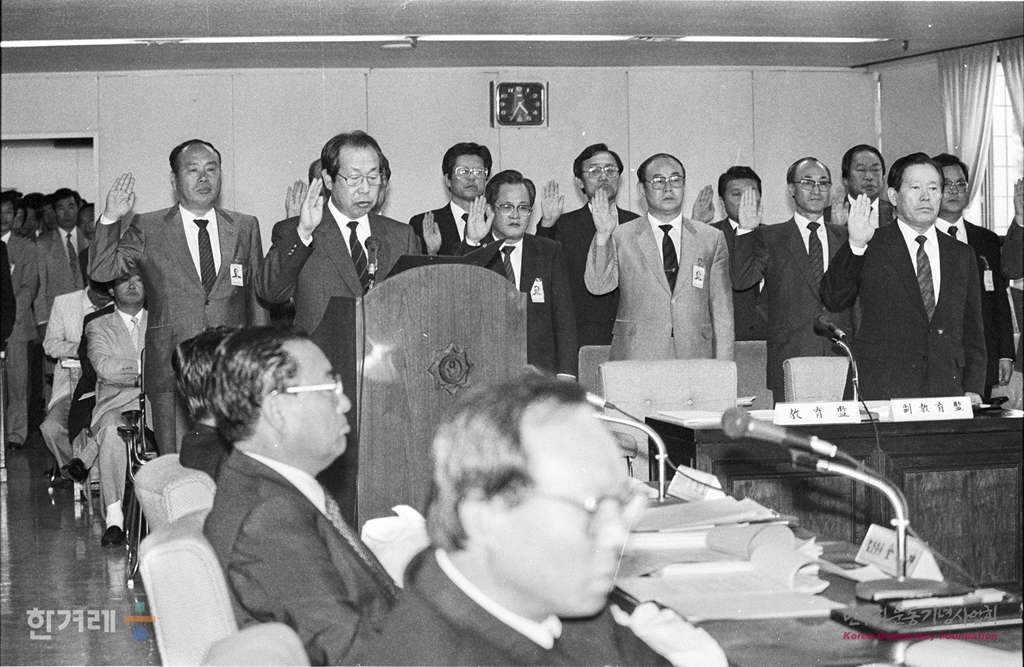 - 1988년 10월 6일 서울시교위 감사에서 전두환 전 대통령 부인 이순자씨가 회장으로 있는 새세대육영회의 설립경위 및 기금모습과정과 운영사항의 의혹이 불거진 가운데 서울시교위 관계자들이 증언에 앞서 증인선거를 하고 있다.