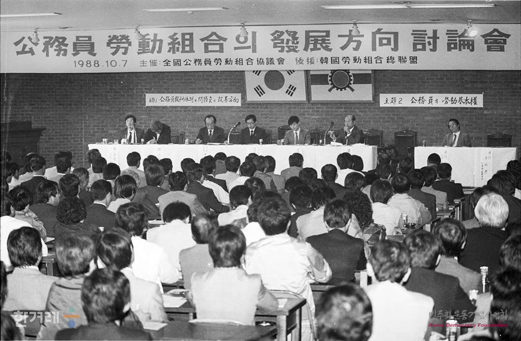 - 1988년 10월 7일 공무원 노동조합협의회(공노협)주최로 서울 영등포구 여의도동 한국노총회관에서 열린 ‘공무원 노동조합의 발전 방향 토론회’에 공노협 산하 체신,철도,국립의료원 노조 조합원 450여명이 참가해 토론회를 지켜보고 있다.