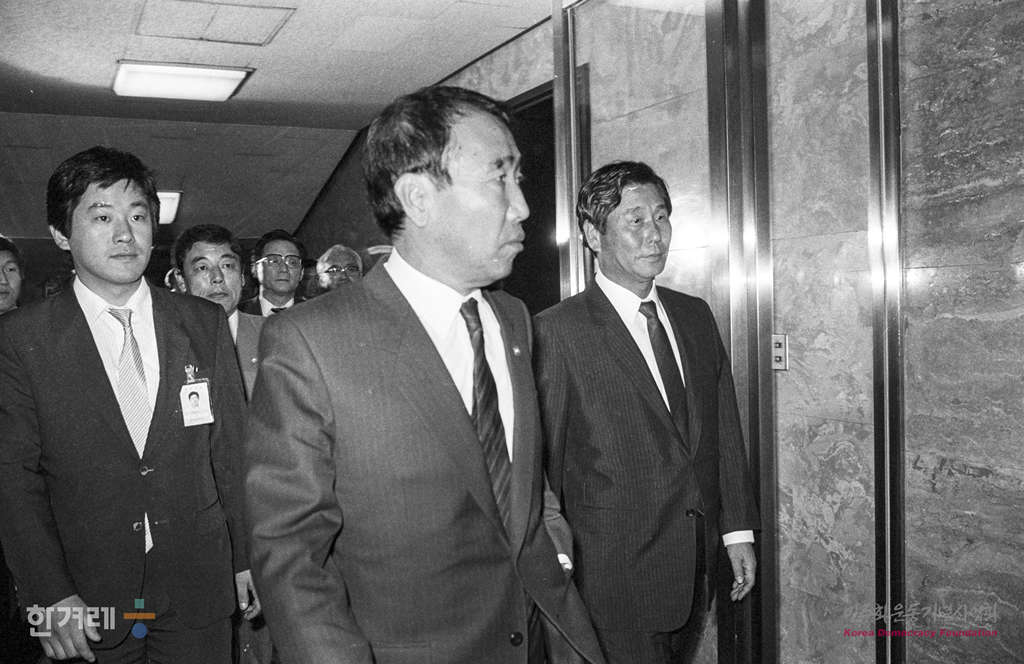 - 1988년 10월 7일 민정당 의원들이 국회에서 의원총회를 열고 대학생들의 민정당 의원회관 점거사건에 동조한 야당의원 보좌관 징계 및 재발방지대책 등을 야권에 요구하기로 결정한 가운데 의원총회를 마친 정호영의원이 회의실을 나서고 있다.