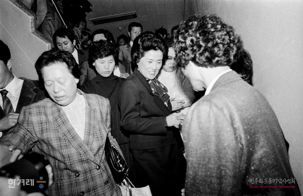 - 1988년 10월 14일 오후 1시 40분 전두환씨가 대통령에서 물러난 뒤 8개월 만에 공식석상에 모습을 나타난 이순자씨가 새세대육영회관에 도착한 뒤 연홍숙 사무처장을 안내로 회의실로 들어가서고 있다.