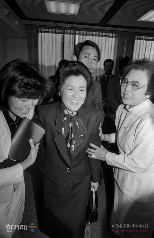 - 1988년 10월 14일 오후 1시 40분 전두환씨가 대통령에서 물러난 뒤 8개월 만에 공식석상에 모습을 나타난 이순자씨가 새세대육영회관에 도착한 뒤 연홍숙 사무처장을 안내로 회의실로 들어가서고 있다.