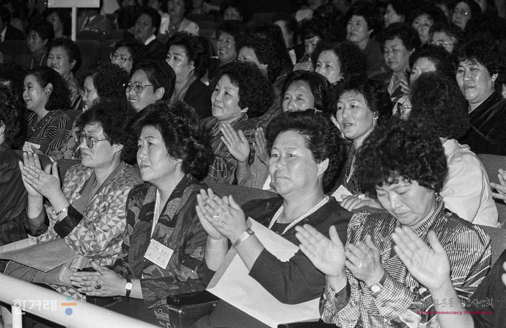 - 1988년 10월 14일 오후 1시 40분 전두환씨가 대통령에서 물러난 뒤 8개월 만에 공식석상에 모습을 나타난 이순자씨가 새세대육영회관에 도착한 뒤 5층 회의장에서 인사말을 하자 참석자들이 박수를 치고 있다.