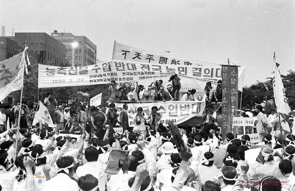 - 1988년 5월 26일 오후2시 농수산물 수입을 반대하는 전국농민 결의대회가 경찰의 원천봉쇄조치에도 불구하고 전국 각지의 농민 3천여명과 주요야당대표들이 동참한 가운데 서울 영등포구 여의도광장에서 열리고 있다.