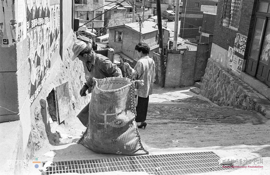 - 1988년 5월 15일 달동네의 집주인은 절반 이상이 재개발된 뒤 전매이익을 노리는 복부인과 투기꾼들. 따라서 이곳 주민은 자기집에서 살고 있는 몇 안되는 가옥주들을 빼면 40~50%가 세입자들이다. 전세 또는 4~5만원의 삭월세를 든 세입자들은 그 동네가 재개발지구로 책정되면 가장 타격을 입는다. 가옥주가 아니라서 아파트 입주권도 안 나오고 아무 보상도 없이 지금까지 닦아온 삶의 터전을 떠나야 하기 때문이다. 사진은 서울 봉천동일대 달동네