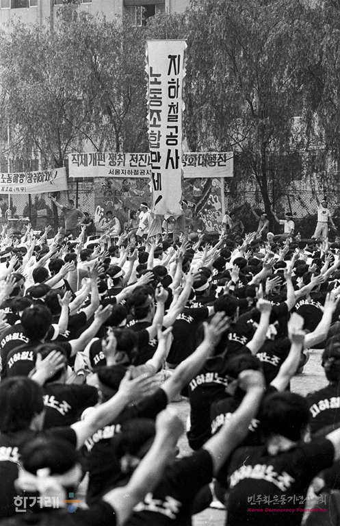 - 1988년 6월 11일 오전 11시 서울지하철노조 노합원 2천여명은 서울 성동구 용답동 용답축구장에서 직제개편쟁취 전진대회를 갖고 직제개편 단행을 촉구하고 있다.