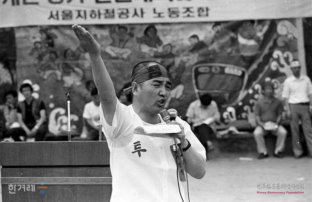 - 1988년 6월 11일 오전 11시 서울지하철노조 노합원 2천여명은 서울 성동구 용답동 용답축구장에서 직제개편쟁취 전진대회를 갖고 직제개편 단행을 촉구하고 있다.