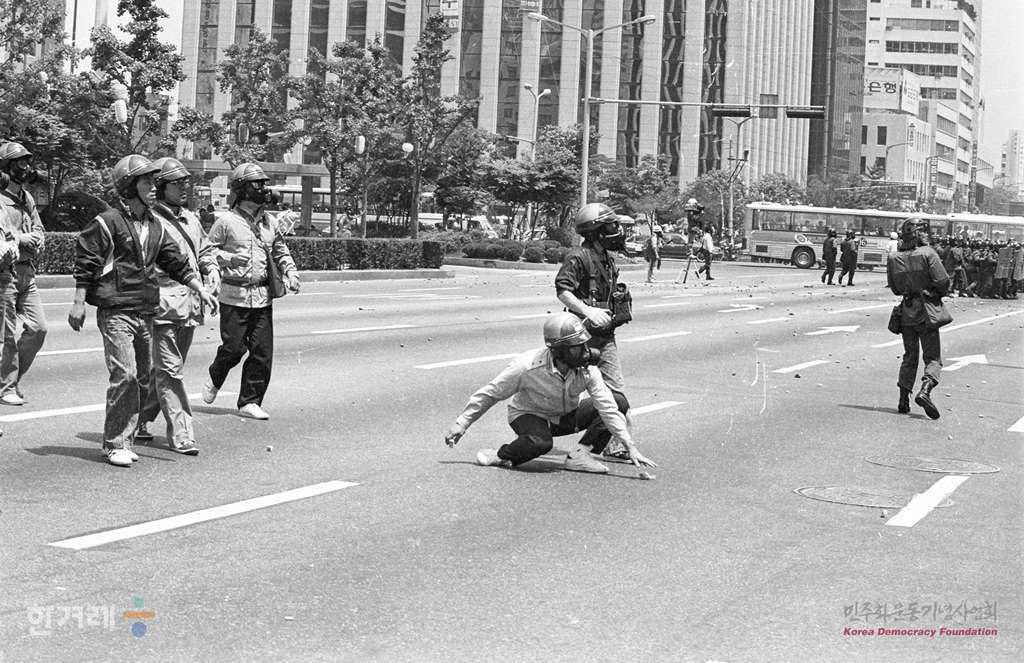 - 1988년 6월 10일 전국 대학생 대표자협의회가 주도하는 610 남북청년학생 체육회담을 위한 학생들의 판문점행이 경찰의 강력한 저지로 좌절된 가운데 대학생들이 서울시내 일대에서 거리시위를 벌이자 경찰들이 저지하고 있다.