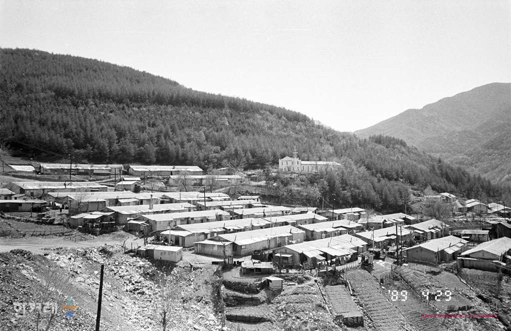 - 1989년 5월 3일 동원탄광 주변에 무질서하게 들어선 사택촌, 광산노동자들은 도급제가 폐지되지 않은 가운데 올해 임금 인상폭이 자신들의 요구보다 낮은 15.5% 인상에 그치자 불만을 보이고 있다.