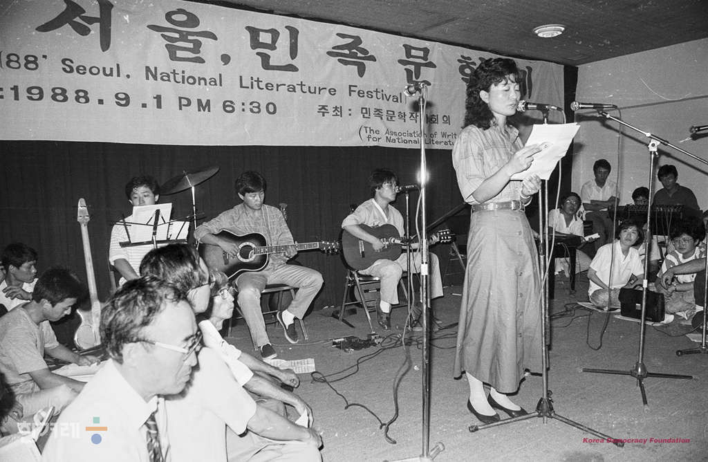 - 1988년 9월 1일 오후 6시 30분 민족문학작가회의(의장 김정한)가 주최하는 ‘88서울민족문학제’가 서울 여의도 백인회관강당에서 열려 한 참가자가 시낭송을 하고 있다.