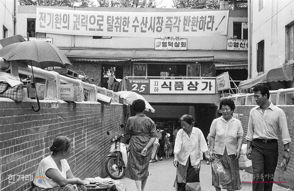 - 1988년 9월 2일. 노량진수산시장 운영권 이전 의혹 사건과 관련해 청와대비서실을 등에 업고 시장운영권을 강제로 빼앗은 전두환 전대통령의 친형인 전기환씨에 대한 문제제기가 대두되면서 서울 노량진수산시장입구에 수산시장 운영권 반환을 요구하는 현수막이 걸려있다.