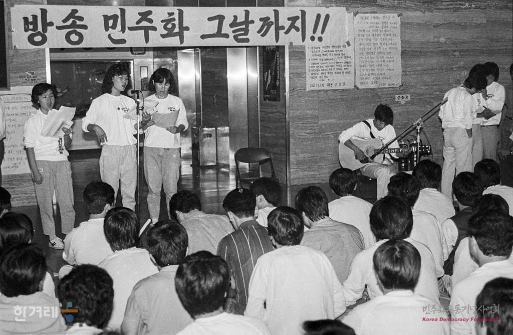 - 1988년 9월 5일 kbs노동조합 조원원들이 회사로비에서 보도국장 직선제와 유니온숍인정 등 요구하며 쟁의발생신고 7일째 이어가고 있다.