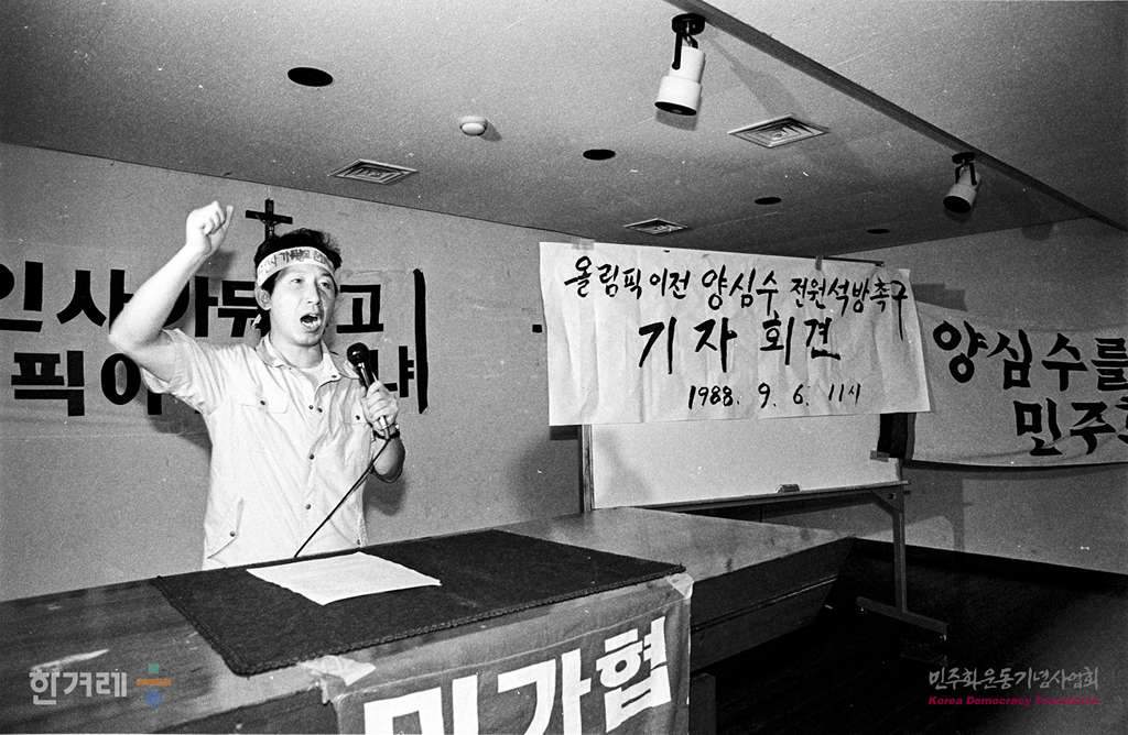 - 1988년 9월 6일 민가협, 민통련, 자주민주통일국민회의 등 16개 재야 민주단체 대표 및 회원 1백50여명은 서울 종로구 종로성당 3층 강당에서 공동 기자회견을 갖고 올림픽 이전 양심수 전원 석방을 촉구하고 있다.