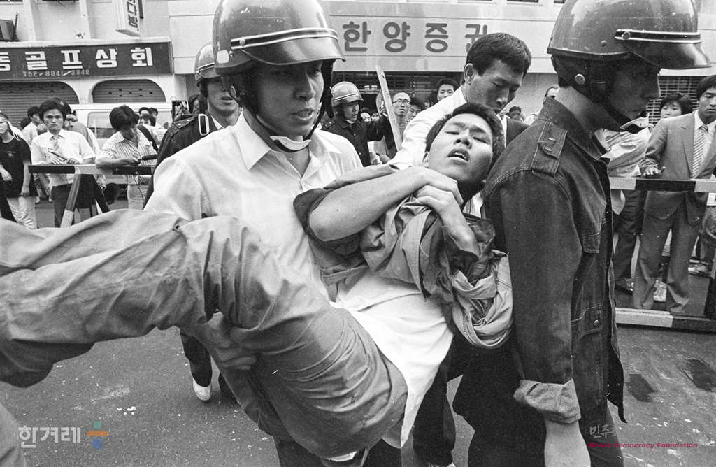 - 1988년 9월 17일 오후5시 서울지역총학생회연합 소속 대학생 7백여명은 중구 소공동 롯데쇼핑앞에서 분단올림픽 반대 등의 구호를 위치며 시위를 벌이다 경찰에 연행되고 있다.