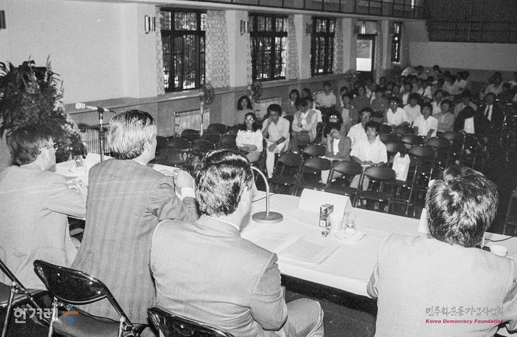 - 1988년 9월 20일. 학문 사상과 출판의 자유를 위한 공청회가 학국산업사회연구회를 비롯한 11개 학술단체와 한국출판문화운동협의회가 주최하는 학문 사상 출판 자유를 위한 공청회가 서울 명동 YMCA대강당에서 열려 참석자들이 열띤 토론을 하고 있다.