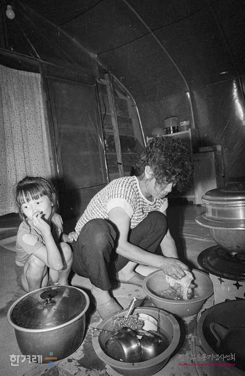 - 1988년 9월 21일 서울 상계동 철거민들이 땅을 구입한 경기도 남양주군 별내면 덕송리 배밭 한가운데 만든 비닐하우스촌 나래마을은 입주주민이 설거지를 하고 있다.