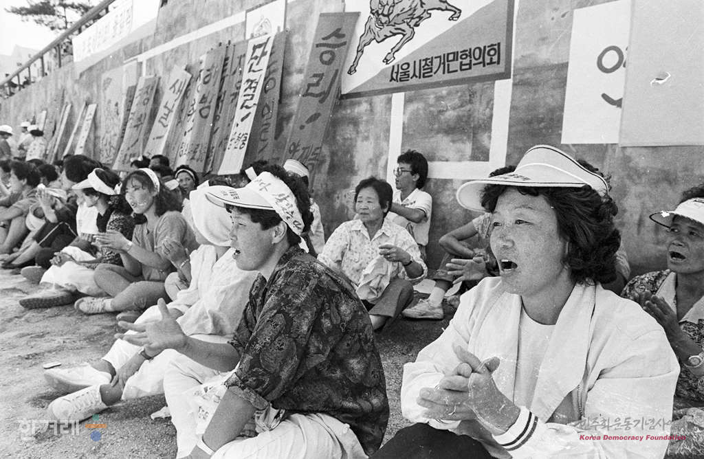 - 1988년 9월 21일. 서울지역철거민협의회 소속 회원들이 서울 흑석동 중앙대학교 운동장에서 제1회 도시빈민올림픽을 하고 있다. 1987년 7월 17일 결성된 서철협은 사당3동, 오금동, 신당동, 사당2동, 돈암동 등에서 철거민 투쟁이 확대되고 1988년에는 서초동 꽃마을, 홍은동, 도화동, 신정동, 전농동, 석촌동 등에도 확대되어 1993년 전국단위조직인 전국철거민협의회로 출범했다.