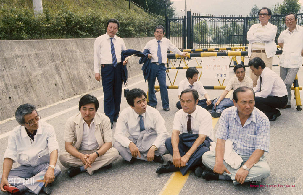 - 1988.08.12. 청남대에 도착한 국회 5공비리 조사특위 야당쪽 의원들이 굳게 닫힌 정문앞에서 청와대쪽의 방문거부에 항의 농성을 하고 있다.