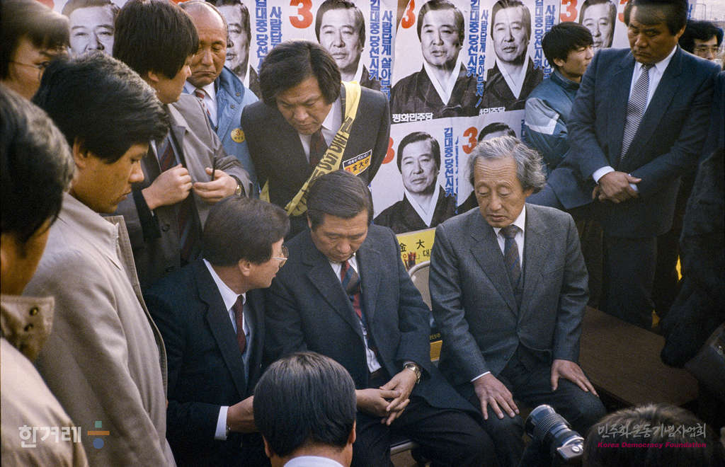 - 1987년 10월 개정된 제9차 개정 헌법에 따라 16년 만에 대통령 직선제가 부활한 제13대 대통령선거에서평화민주당 후보로 출마한 김대중후보가 문익환목사를 비롯한 관계자들과 얘기를 나누고 있다