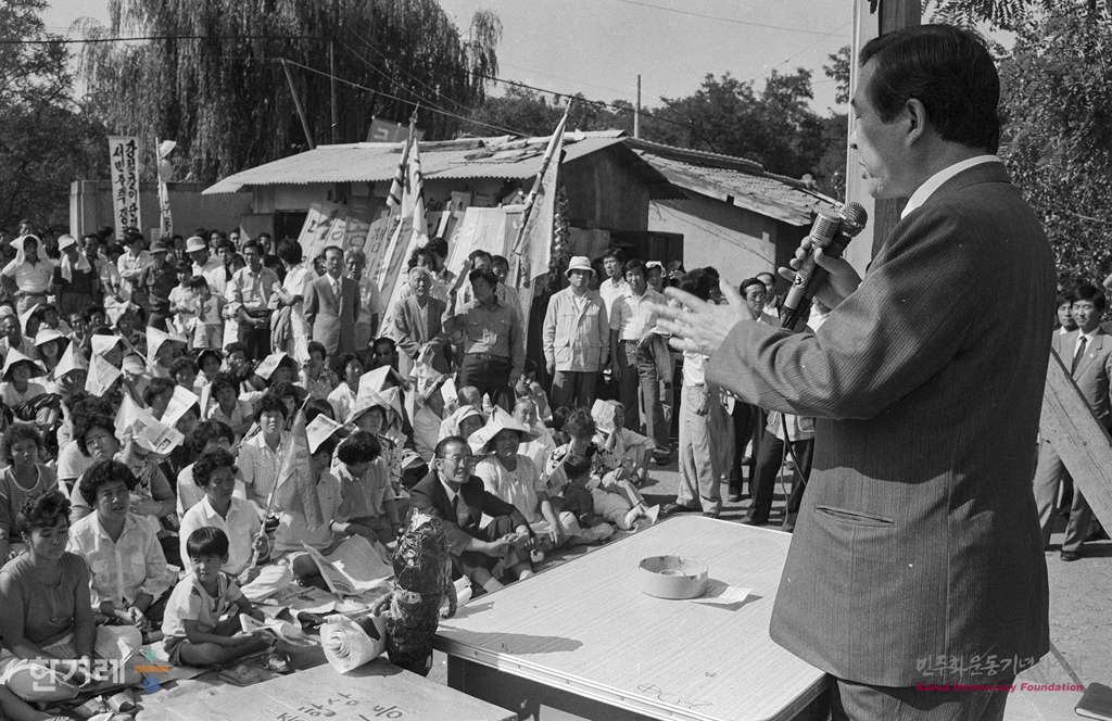- 1988년 9월 19일 김대중 평화민주당 총재가 서울올림픽이 열리는 가운데 서울 성북동 철거지역에서 열린 도시빈민 한가위 올림픽에 방문해 인사말을 하고 있다.
