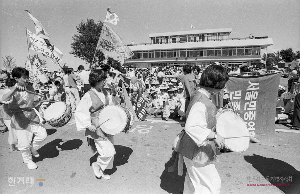 - 1988년 7월 3일 통일염원 범국민 평화대행진 둘째날 임진각에서 각계인사와 시민 청년 5백여명이 참석한 가운데 통일기원제를 하고 있다. 특히 이날은 야당에서 민주당의 김영삼총재와 평민당의 문동환 부총재가도 참석했다.