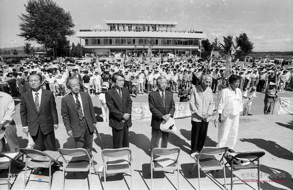 - 1988년 7월 3일 통일염원 범국민 평화대행진 둘째날 임진각에서 각계인사와 시민 청년 5백여명이 참석한 가운데 통일기원제를 하고 있다. 특히 이날은 야당에서 민주당의 김영삼총재와 평민당의 문동환 부총재가도 참석했다.