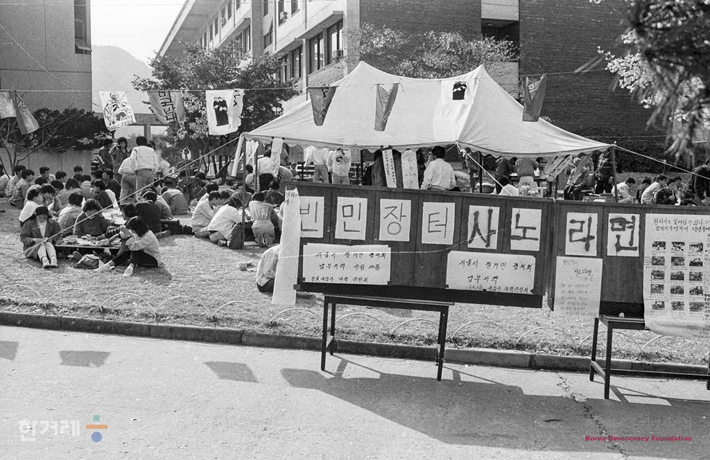 - 1988년 10월 28일. 서울대 축제 자주관악제 기간동안 서울철거민협의회 남부지부 회원 20여명이 대학내 본관옆에서 도시빈민장터 사노라면을 열어 많은 학생들의 호응을 받고 있다.
