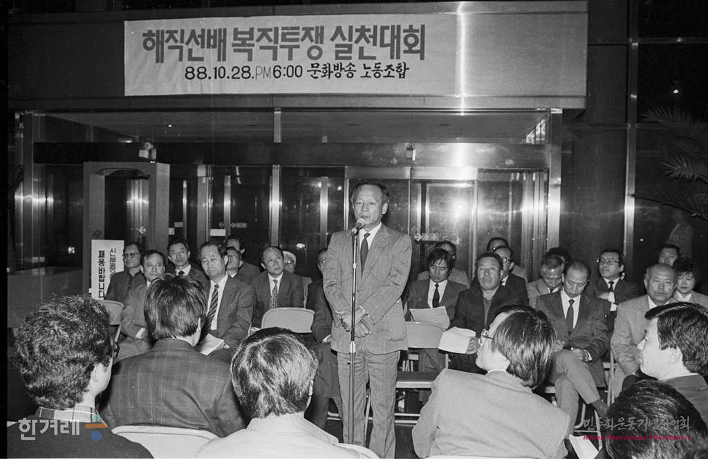 - 1988년 10월 28일. 오후6시 문화방송 해직자 복직투쟁위원회 회원들과 문화방송 노조 조합원들이 본사 1층 로비에서 해직선배 복직투쟁 실천대회를 갖고 80년대 언론대학살의 철저한 진상규명과 해직자 전원복직을 촉구하고 있다.