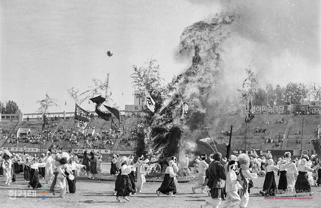 - 1988년 10월 23일 전국민속예술경연대회가 열린 전주공설운동장에서 한 참가자팀이 지역의 특징을 살리는 공연을 펼치고 있다.