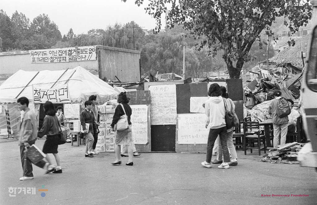 - 1988.10.22. 지난 14일 오후1시 3백여 명의 철거반원에 의해 순식간에 삶의 보금자를 읽은 40여 세대의 주민들은 대책 없는 강제 철거에 반대하며 이대정문앞에서 천막 생활을 하고 있다. 이 지역 철거민들이 삶의 터전을 읽은 현장에 ‘철거라면’이라는 공동의 일터를 만들어 생계를 이어가고 있다.