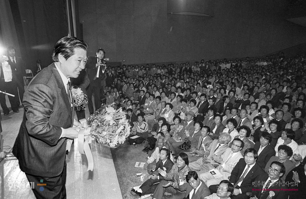 - 1989년 10월 28일 포항과 청송 영덕 지구당 창당 및 개편대회에 참석하기 위해 깅북에 내려온 김대중 평민당 총재가 참석자들에게 손을 들어 인사를 하고 있다.