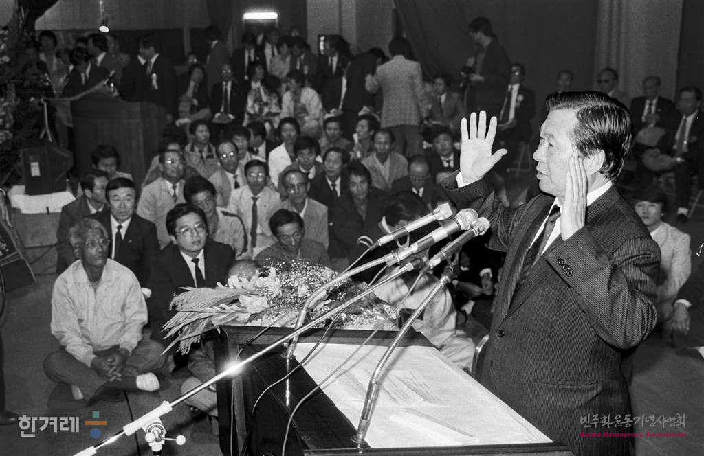 - 1989년 10월 28일 포항과 청송 영덕 지구당 창당 및 개편대회에 참석하기 위해 깅북에 내려온 김대중 평민당 총재가 참석자들에게 손을 들어 인사를 하고 있다.