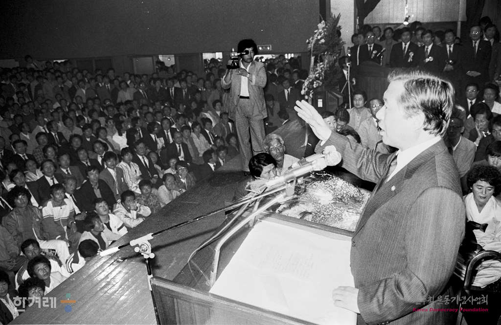 - 1989년 10월 28일 포항과 청송 영덕 지구당 창당 및 개편대회에 참석하기 위해 깅북에 내려온 김대중 평민당 총재가 참석자들에게 손을 들어 인사를 하고 있다.