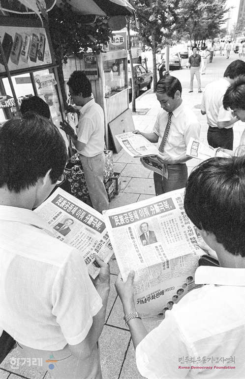 - 1988년 7월 7일 노태우대통령이 새로운 대북정책인 민족자존과 통일번영을 위한 특별선언 발표하자 시민들이 신문에 보도된 선언내용들을 읽고 있다.