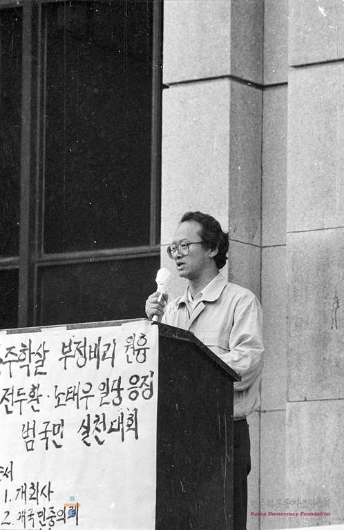 - 1988년 6월 19일 낮 12시 광주학살 부정 비리원흉 전 노 일당 응징 범국민 1차 실천대회가 서울민주투쟁연합과 서건추주최로 서울 연세대 민주광장에서 열려 학생 시민들이 참석한 가운데 열리고 있다. 이들은 집회를 마친 뒤 연희동 전두환씨 집까지 가두행진을 벌일 계획이었지만 경찰의 저지로 무산됐다.