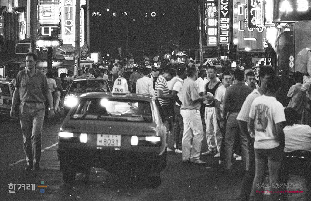 - 1988년 9월 8일 주한미군과 가족의 한국인에 대한 무분별한 폭력행사가 늘고 있는가운데 경찰은 한미행정협정 탓에 제대로 수사조차 못하고는 있다는 비판이 잇따르고 있다. 사진은 최근 주한미군의 폭력사건이 자주 발생하는 이태원의 야경