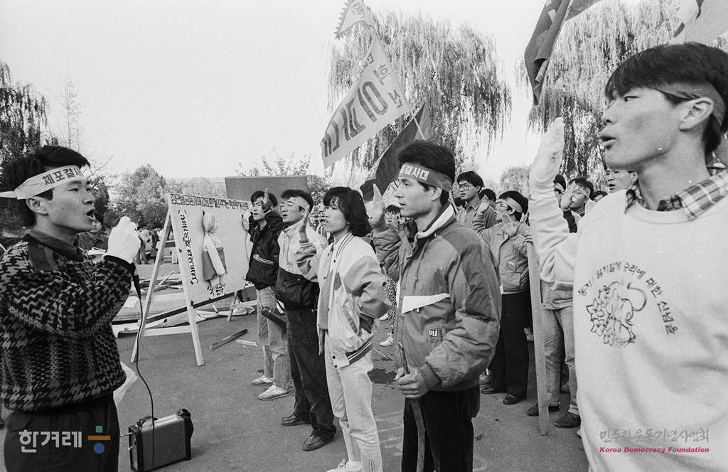 - 1988년 11월 2일 전두환 이순자 구속처벌을 위한 학생투쟁연합을 결성한 각 대학들이 체포결사대를 조직하는 가운데 서울 건국대에서 결성된 체포결사대 학생들이 집회를 갖고 있다.